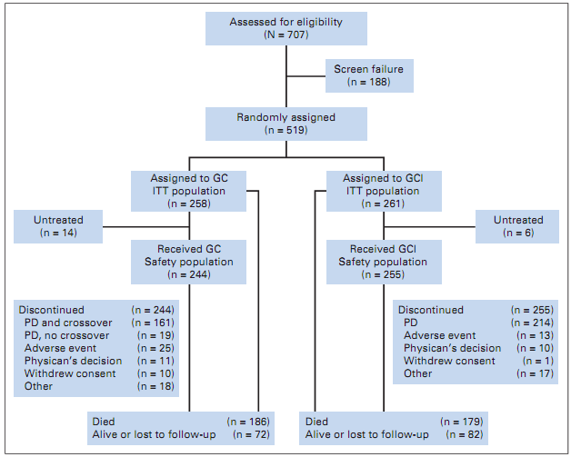 在这一非盲的III期试验中,2009年7月至2010年3月之间,519位以前应用过2种或2种以下的化疗方案的IV期/局部复发的三阴性乳腺癌患者被随机分配到吉西他滨(1,000 mg/m2)+卡铂(曲线下面积为2,第1天和第8天应用)组(n = 258)或吉西他滨+卡铂+ iniparib(第1, 4, 8和11天,5.6 mg/kg,静脉滴注)组(n = 261),每3周一疗程。根据以前应用化疗方案的数目进行随机分层。