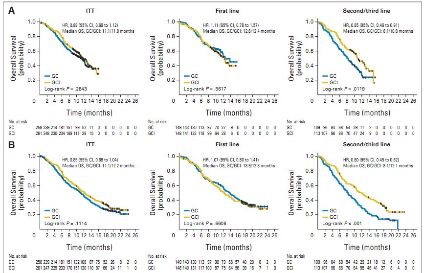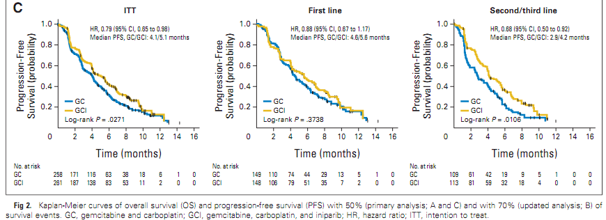 一个在70%的患者死亡后的更新的总生存期分析显示,总生存期的中位数分别为12.2和11.1个月(HR =0.85, 95% CI = 0.69–1.04),其中应用一线治疗的患者的总生存期的中位数分别为12.3和13.9个月(HR = 1.07, 95% CI = 0.80–1.40),应用二线及二线以上的治疗的患者的总生存期的中位数分别为12.1和8.1个月(HR = 0.60, 95% CI = 0.45-0.82)。