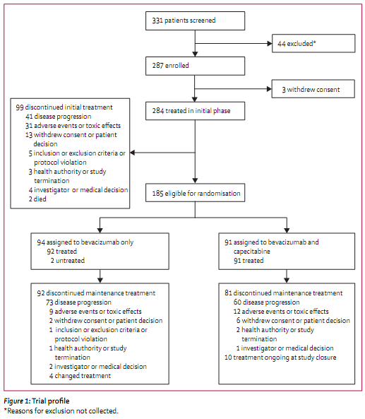 在2009年7月16日至2011年3月7日(此时入组早期终止)之间,284位患者一开始应用贝伐单抗+多西他赛方案治疗。185位患者参与了随机分组(91位患者被分配到贝伐单抗+卡培他滨组,94位患者被分配到贝伐单抗单药治疗)。