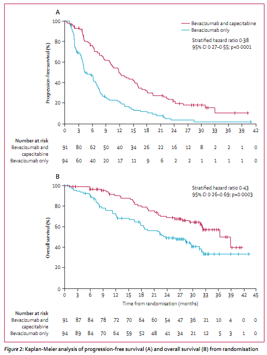 贝伐单抗+卡培他滨组患者的无进展生存期(中位数11.9个月[95% CI 9•8—15•4])明显长于贝伐单抗单药治疗组(中位数4.3个月[95% CI 3•9—6•8],分层的风险比为0•38 [95% CI 0•27—0•55],双侧秩和检验p<0•0001)。贝伐单抗+卡培他滨组患者的总生存期(中位数39•0个月[95% CI 32•3—未知])也明显长于贝伐单抗单药治疗组(中位数23•7个月[95% CI 18•5—31•7],分层的风险比为0•43 [95% CI 0•26—0•69],双侧秩和检验p=0•0003)。疾病进展的时间间隔结果与无进展生存期的结果一致。贝伐单抗+卡培他滨组的78位(86%)患者和贝伐单抗单药治疗组的72 位(77%)患者达到客观缓解。贝伐单抗单药治疗组中92 位(98%)患者临床获益,贝伐单抗+卡培他滨组90位 (99%)患者临床获益。基础状态时全球健康评分的变化的平均值在各组间没有明显差异。