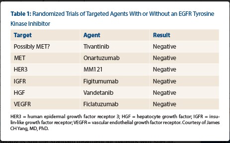 许多随机实验中,无论EGFR酪氨酸激酶抑制剂的是否联合针对另一条通路的靶向药物,结果都是阴性的(见表1)。Yang博士说:“非选择性人群可能是失败的主要原因。但是即使是在正确的人群中,不仅需要正确的突变,相关治疗靶向分子也很重要。”