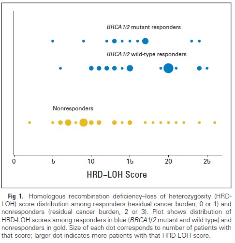 对于早期三阴性及BRCA1/2突变相关的乳腺癌患者在术前进行吉西他滨、卡铂及iniparib联合治疗是有效的。HRD-LOH分析可以偶尔识别出没有BRCA1/2突变的三阴性乳腺癌患者,但是HRD-LOH分数较高意味着获得较好病理缓解。