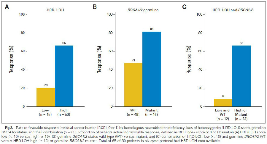 所有意向治疗人群(n = 80)中的病理完全缓解率为36% (90% CI, 27 至 46)。在排除了BRCA1/2生殖细胞系突变携带者后,与没有应答组相比,有应答组中的中位HRD-LOH评分更高(P = .02),且具有显著差异。
