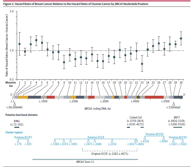 对致癌风险比的分析揭示了乳腺癌决定簇区域(BCCRs),卵巢癌决定簇区(OCCRs)。 BRCA1基因中藏有3个 BCCRs,其中一个是在一个高度保守的结构域(RING),已被发现与乳腺癌的风险增加有关;其含有的唯一的OCCR在外显子11中,其位于外显子24结构中部一个高度突变区域中。 BRCA2包含三个BCCRs和三个OCCRs。