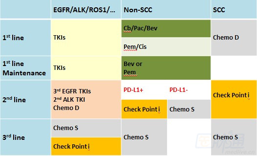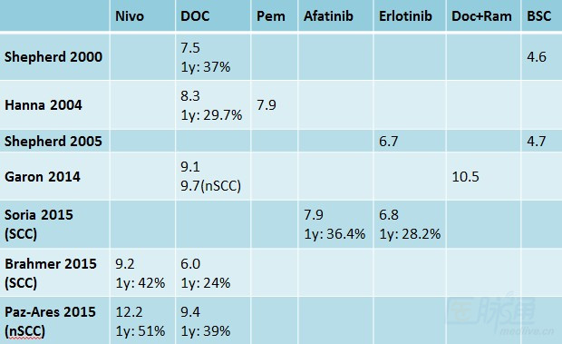 通过表1可以看出,在疗效方面,免疫检查点抑制剂(Checkpoint inhibitor)应该成为NSCLC尤其是肺鳞癌二线标准治疗的选择之一。目前Nivolumab已成为肺鳞癌治疗的标准,但高昂的费用可能成为瓶颈。肺非鳞癌患者应用PD-1或PD-L1抑制剂,PD-L1高表达有助于选择合适的患者。
