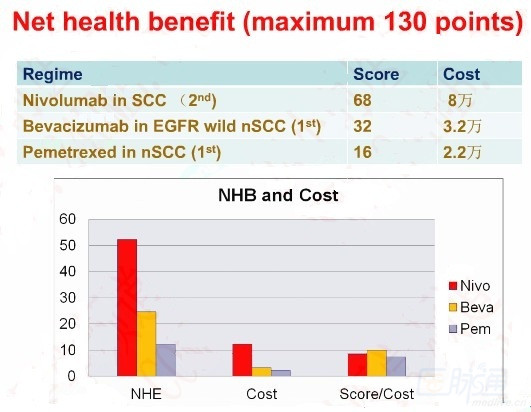 ASCO年会上公布了针对药物治疗价值的评分,涵盖疗效(OS)、毒性和费用等。下图总结了Nivolumab、贝伐珠单抗和培美曲塞用于肺癌的价值。净获益(综合疗效和毒性)最大的是免疫治疗Nivolumab,其次是贝伐珠单抗,但是治疗费用也同样如此。考虑相同费用带来的获益,三者得出的数值相差不大。因此,临床医生在诊疗过程中需要对此进行权衡。