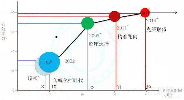 回顾肺癌发展的历程,进展从未停止,“精准治疗”使驱动基因型肺癌逐渐变为临床可控的疾病,从传统化疗时代的10个月生存时间,到如今已达到39个月(图1)。