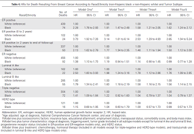 结果显示黑种人乳腺癌患者总体死亡风险比高出白种人患者21%(HR=1.21,95%CI=1.00-1.45),而在2年的随访中,激素受体阳性的黑种人和白种人的生存差异是最大的(0-2年:HR=2.65,95%CI=1.34-5.24;2年-随访结束:HR=1.50,95%CI=1.12-2.00)。luminal A型和luminal B型的黑种人患者死亡的可能性甚至比白种人分别高出了76%和56%。但是HER2阳性和三阴性的患者死亡率则无统计学差异。亚裔和拉美裔患者与白种人患者相比则有较低的死亡率(亚裔:HR=0.56,95%CI=0.37-0.85;拉美裔:HR=0.74,95%CI=0.58-0.95)。