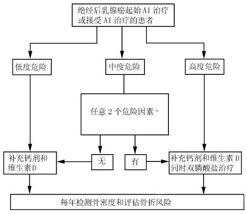 图1 接受芳香化酶抑制剂(AI)治疗的绝经后乳腺癌患者骨丢失和骨质疏松的临床管理路径