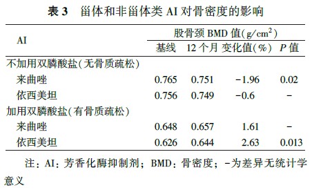 3.药物选择:AI 包括非甾体(阿那曲唑和来曲唑)和甾体(依西美坦)两大类。甾体类AI 具有独特的雄激素样结构,较非甾体类AI 对骨安全的影响较小。有研究证实,甾体类AI和非甾体类AI降低雌激素水平和增加骨吸收标志物水平的程度相近,但甾体类AI依西美坦治疗24周可持续增加血清骨形成标志物Ⅰ型原胶原N端前肽(procollagen typeⅠN-terminal propeptide , PINP)水平,基线校正的0~12周和0~24周PINP曲线下面积显著大于阿那曲唑和来曲唑。另有临床研究显示,甾体类AI对早期骨密度的影响较小,且在接受双膦酸治疗后,骨密度上升较快(表3)。Goss等研究显示,应用依西美坦和阿那曲唑治疗12个月后,股骨颈的BMD 变化值分别为-0.62和-1.66,差异有统计学意义(P=0.01)。