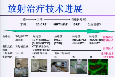 放射治疗技术要先有物理意义的进步才有临床意义的。通过提高肿瘤的照射剂量实现提高局部的控制率和生存率;通过降低正常组织剂量,达到降低正常组织毒副作用和增加新的放疗适应症的目的。