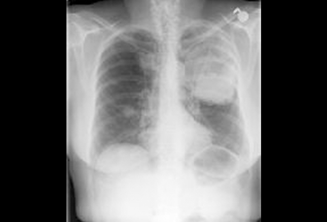 正面胸片显示左肺沉积扩张至左肺上叶,同时可见右肺中叶结节,以及广泛的气管周围淋巴结。