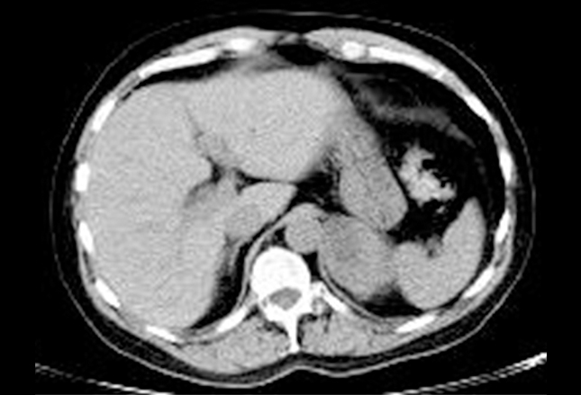 肾上腺也是SCLC扩散的常见部位。上图为腹部肾上腺处非增强CT扫描,可见大的低密度左肾上腺组织。对于SCLC患者,这种情况很可能是疾病转移的表现。