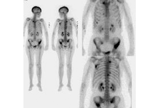 SCLC常见骨转移。上图为SCLC患者正面及背面全身骨扫描。脊柱、肋骨、左肩胛骨和骨盆均可见放射性示踪剂摄取,提示骨转移。