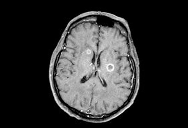 以上突变与NSCLC的相关性更加普遍。脑部是SCLC常见的扩散部位。上图为SCLC患者的脑部轴向对比剂增强MRI,室旁区可见两个环形强化病灶。
