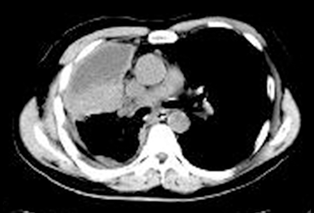 上图为SCLC患者的肺门CT扫描。右侧可见一个大的肺门肿瘤及肺膜增厚,提示胸膜转移。肿瘤组织周围可见局部肺积液,提示肺不张。