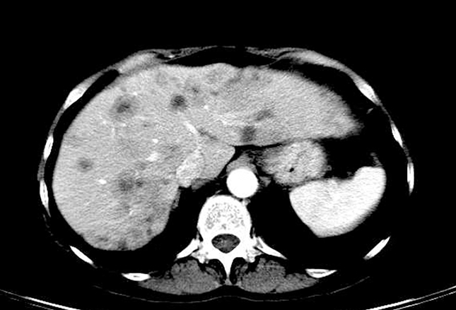上图为SCLC患者对比增强CT扫描,显示出肝脏无数低密度病变。综合考虑SCLC病史、肝脏低密度病变及肝脏病变边缘模糊,该患者很可能发生SCLC转移。