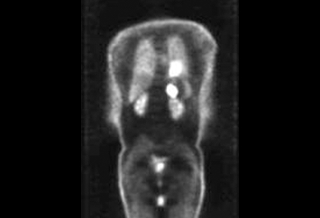 如(上篇第六张图中)表格所示,局限期SCLC应局限于一个射野内。[2]上图为SCLC患者冠状位PET扫描,可见左肺门和左肾上腺摄取增加,提示可能发生SCLC转移。