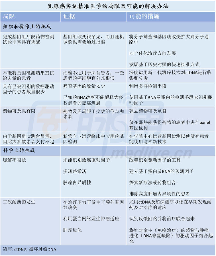 精准医学的发展给转移性乳腺癌的管理带来了希望,使人们对其未来发展充满遐想。然而,在临床实践的背后总存在着科学上的和实际操作的阻碍。Nat. Rev. Clin. Oncol杂志于7月21日在线发表了一篇综述,论述了精准医学给转移性乳腺癌管理带来的挑战和可能的解决办法。医脉通小编将其整理如下表,以飨读者。
