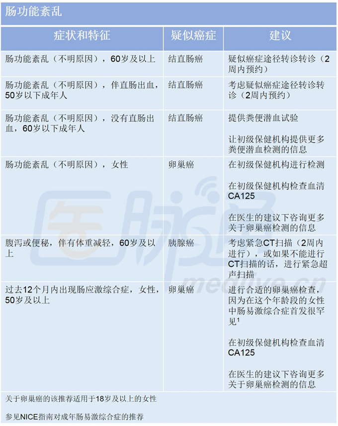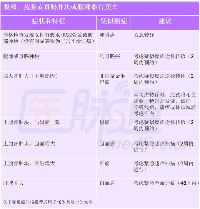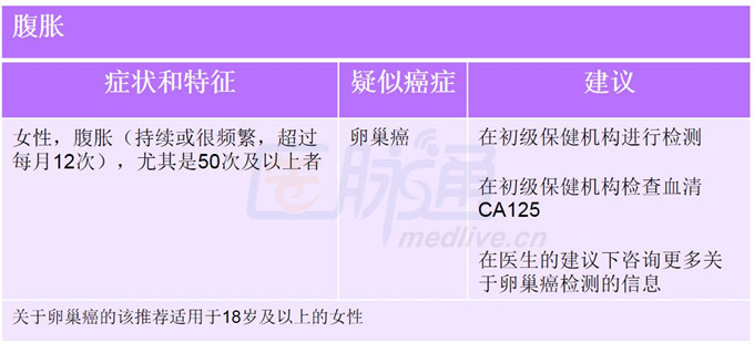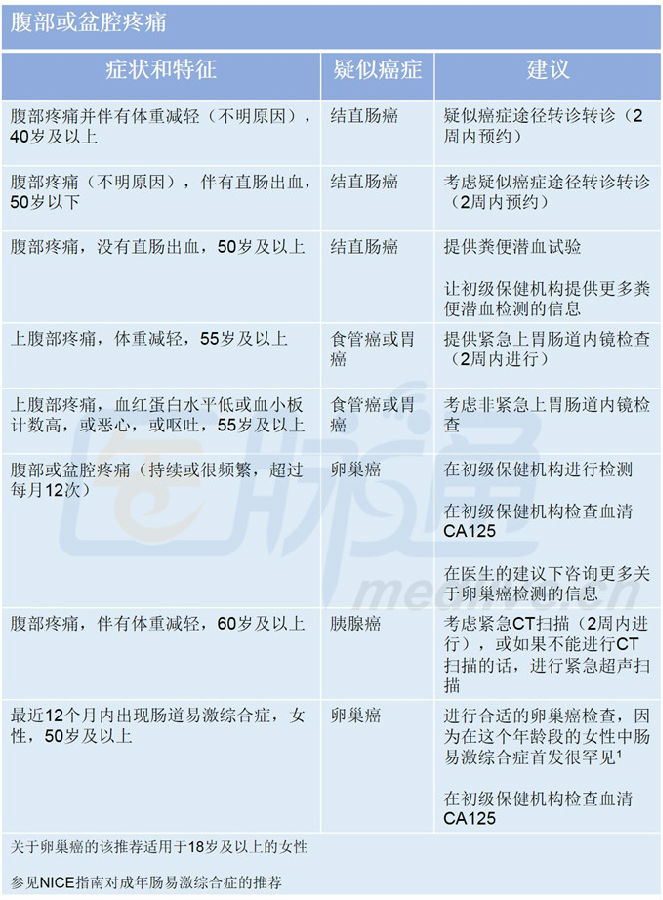 近期,NICE发布了2015版《疑似肿瘤患者:识别和转诊》指南。该版指南用于指导全科医生根据患者临床征兆对其进行更早的肿瘤筛查。该指南对2005版指南在内容上进行了彻底的更新,更加注重促使患者去医院就诊的临床症状,而不是集中在某具体癌种的临床特征。医脉通整理了该版指南中,腹胀、腹痛、骨盆疼痛及肠功能紊乱等症状可能对应的癌症,及全科医生应该采取下一步诊断或分诊措施。
