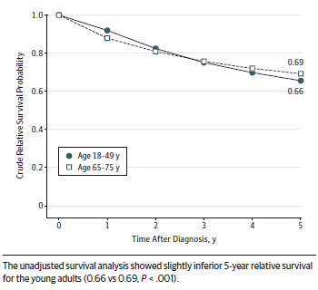 该研究在全国范围的美国外科医师学会(ACS)癌症委员会认可的医院中开展。参与者包含13101例发病年龄在18-49岁的年轻结肠腺癌患者和37007例发病年龄在65-75岁的老年结肠腺癌患者。治疗时间为2003年1月1日-2005年12月31日。患者接受手术切除治疗和可能的术后全身化疗。数据来自于国家癌症数据库。