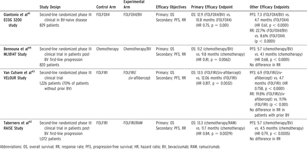 ECOG3200临床研究证实了贝伐珠单抗在二线治疗的价值[14]。这些患者既往均未接受过贝伐珠单抗治疗,既往在接受伊立替康联合5-氟尿嘧啶一线治疗后疾病仍然进展。该研究中,接受FOLFOX/贝伐珠单抗治疗的患者比FOLFOX对照组缓解率高、无疾病生存期和总生存期改善(表2)。但是,在临床实际中,大部分需要二线治疗的患者既往使用过贝伐珠单抗。对于贝伐珠单抗治疗后仍进展的患者,3项随机III期临床试验报道了抗新生血管药物对这些患者的作用[14-16]。试验结果见表2。ML18147和RAISE临床研究均要求入组既往贝伐珠单抗治疗后进展患者,结果显示贝伐珠单抗和ramucirumab明显改善无疾病生存期和总生存期[17]。VELOUR临床研究包括既往接受贝伐珠单抗治疗的患者,也包括未治疗的患者。结果显示研究人群无疾病生存期和总生存期改善。以上3个试验中既往贝伐珠单抗治疗过的患者缓解率均无提高。研究的3种药物存在生物学差异,贝伐珠单抗作用靶点为VEGF-A,阿柏西普作用靶点为VEGF-A,VEGF-B和PlGF,ramucirumab作用靶点为VEGFR-2。尽管目前未对3种药物进行直接比较,但贝伐珠单抗相对最安全,而阿柏西普联合化疗出现毒性增加不得不令人关注[16]。上述三种抗新生血管药物均可考虑用于二线治疗,其中贝伐珠单抗因安全性高更受青睐。贝伐珠单抗可与不同化疗方案联用,阿柏西普和ramucirumab仅能与FOLFIRI方案联用。在二线治疗使用FOLFIRI方案时,目前尚无任何临床或生物标志物可指导3种药物的选择。