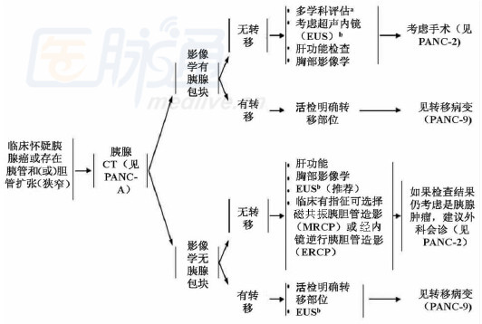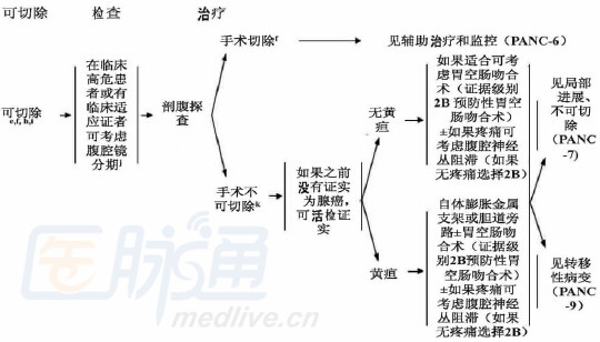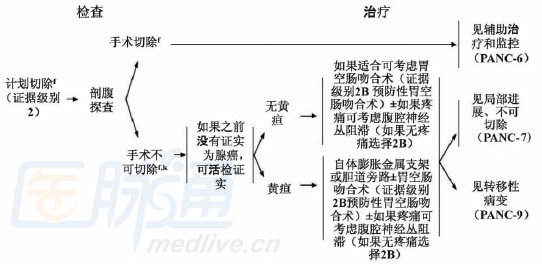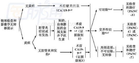 注:c.CA19-9升高并不一定意味着癌或者进展性疾病。CA19-9升高可见于胆道感染(胆管炎),炎症或梗阻,良性或恶性肿瘤。在Lewis抗原阴性的个体可能检测不到CA19-9;d.见诊断、成像和分期原则(PANC-A);e.见可切除状态的定义标准(PANC-B);f.见外科技术(PANC-C)和病理分析:标本方向,组织切片和报告(PANC-D);g.自体膨胀的金属支架用于临床有合并症患者或外科手术可能被推迟的患者