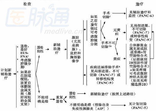 注:h.在有些患者,从技术上可以手术切除,但同时存在预后很差的因素(如CA19-9很高,原发肿瘤病灶很大,局部淋巴结很大,体质量下降很明显,或过度疼痛),可以考虑新辅助治疗(临床试验推荐),这部分患者需要活组织检查证实为腺癌(见PANC-4)。对于有胆道梗阻的患者,应予以持续的胆道减压;i.目前少有证据推荐特殊的新辅助方案,且关于化疗和化放疗的应用变化也较大。可接受的方案包括FOLFIRINOX或吉西他滨+白蛋白结合的紫杉醇。有时需要序贯的化放疗。NCCN成员机构推荐新辅助治疗,不推荐高度可能出现断端阳性的患者实施外科手术;j.见诊断、成像和分期原则(8)(PANC-A);k.见姑息和支持治疗原则(PANC-E)。