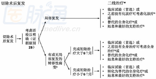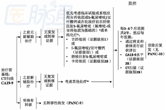 注:m.接受新辅助化放疗或化疗的患者在术后可能会接受其他化疗或多学科评估。对那些没有接受新辅助化疗和手术充分恢复后的患者应接受辅助治疗;治疗应开始于12周内。如果全身化疗早于化放疗,在每次治疗后应重新评价影像学并分期;n.见放疗原则(PANC-F);o.见化疗原则(PANC-G)。