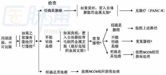 注:p.除非在腹腔镜或剖腹探查时行胆道旁路手术;q.推荐在有多学科诊治的中心行EUS-FAN±核心活组织检查。