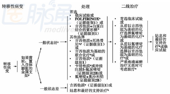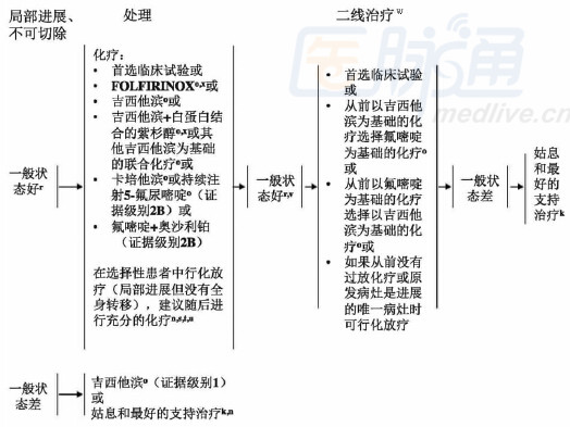 注:r.定义ECOG 0~1为良好的疼痛处理,适宜的胆道支架和充分的营养摄入;s.腹腔镜探查适用于评价远处病变;t.放化疗适用于没有远处转移单接受了全身化疗的患者;u.基于LAP-07试验数据,在吉西他滨单药治疗后追加传统的化放疗并没有明确的提高生存率。化放疗可能利于局部控制,并延长了恢复治疗需要的时间;v.对治疗有显著反应的患者可考虑外科手术切除;w.对一般状态好的患者保留的治疗;x.推荐FOLFIRINOX和吉西他滨+白蛋白结合的紫杉醇用于局部进展的患者。