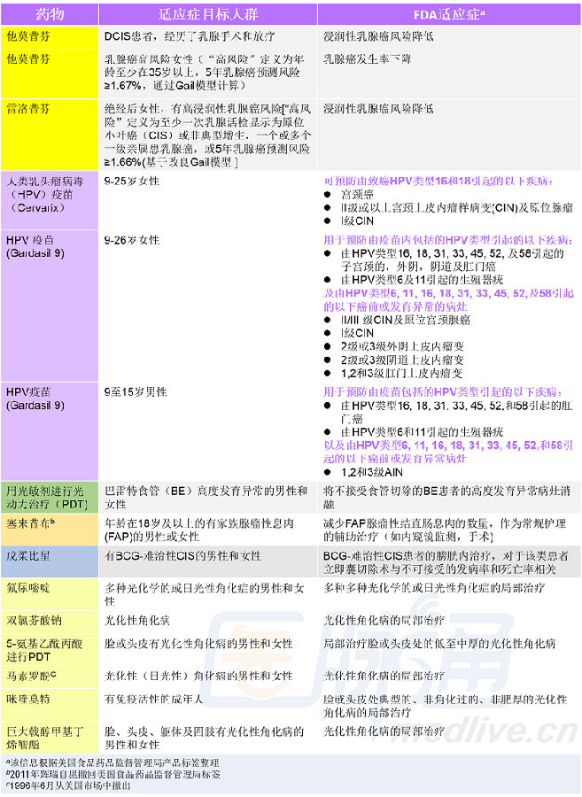 美国食品药品监督管理局批准的用于适应症人群治疗癌前病灶或降低癌症风险的药物