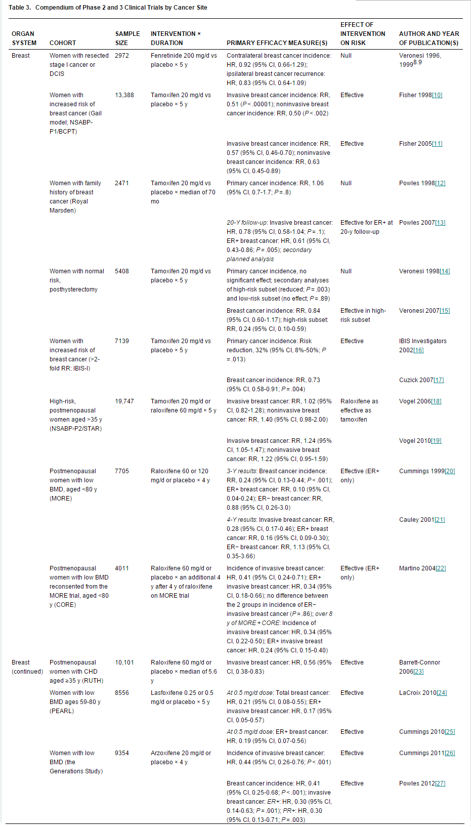 3. Veronesi U, Maisonneuve P, Rotmensz N, et al. Tamoxifen for the prevention of breast cancer: late results of the Italian Randomized Tamoxifen Prevention Trial among women with hysterectomy. J Natl Cancer Inst. 2007;99:727-737.
