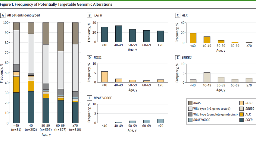 在这种情况下,近期Dana-Farber癌症研究中心的Adrian Sacher博士团队发表的研究4在这一领域迈出了重要的一步。Sacher团队对一个晚期非小细胞肺癌(NSCLC)大型队列进行了关于年龄与可靶向治疗的突变的发生频率以及临床结局的系统性研究。研究人员报告了2237位患者的分子谱和生存数据,分子标志物检测包括了EGFR、ALK、ROS1、ERBB2、BRAF V600E、KRAF突变。