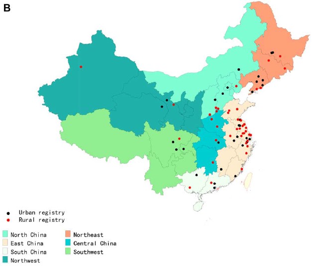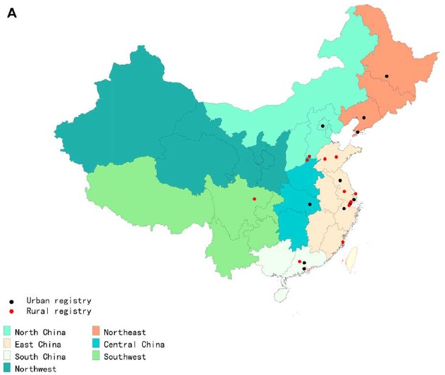 目前通过“中国国家中心癌症注册处”已经可以查到来自基于人群登记处的高质量的数据。作者的数据来源于2009-2011年间的72个地方的、基于人群的癌症登记处的数据,代表了6.5%的人群。这些数据被用来估计2015年癌症新发病例和死亡人数。其中22个登记处的数据被用于趋势分析(2000-2011)。