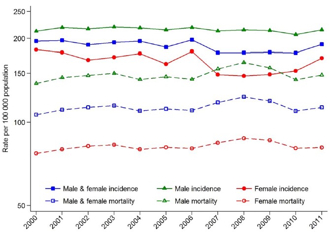 FIGURE 3. Trends in Cancer Incidence and Death Rates (Age-Standardized to the Segi Standard Population) for All Cancers Combined by Sex: China, 2000 to 2011.