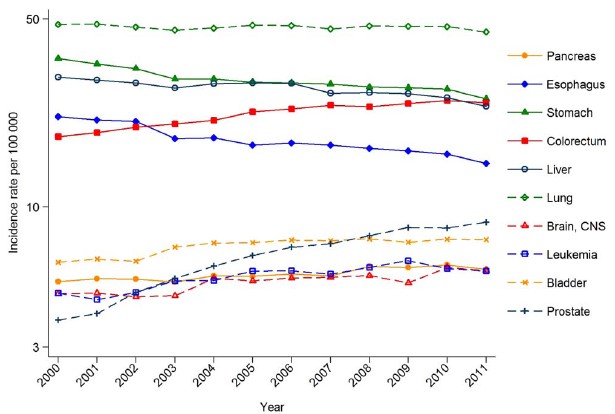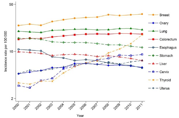 左图:Trends in Incidence Rates (Age-Standardized to the Segi Standard Population) for Selected Cancers for Males: China, 2000 to 2011.右图:Trends in Incidence Rates (Age-Standardized to the Segi Standard Population) for Selected Cancers for Females: China, 2000 to 2011