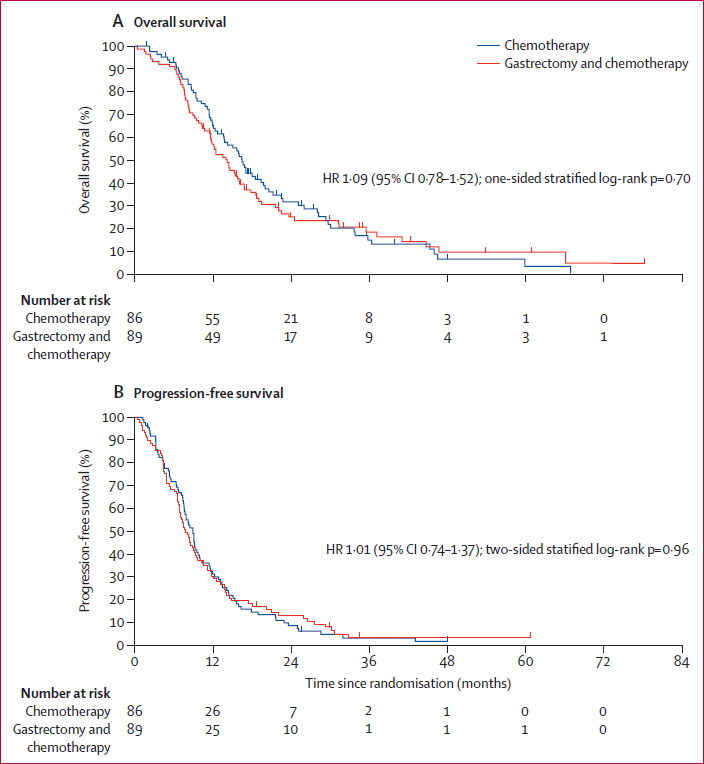 研究入组了175位晚期胃癌患者,年龄20-75岁,均具有单一的不可治愈因素,或者为肝转移(H1)或者为腹膜转移(P1)或者腹主动脉淋巴结转移(16a1/b2)。患者在各个国家的中心中按照1:1随机给予胃大部切除术序贯化疗(n=89)或单用化疗(n=86),患者分组在医疗中心、淋巴结情况和不可治愈因素方面进行了平衡。