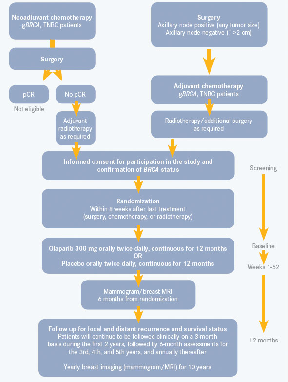 这是第一项评估特异性靶向治疗BRCA突变相关乳腺癌的大型研究,由全球BRCA相关乳腺癌领域的专家领导。参与者要求完成全部的标准治疗,包括化疗、手术以及可能需要的放疗。化疗分为新辅助化疗组或辅助化疗组。患者将被随机1:1给予1年的奥拉帕尼或安慰剂。