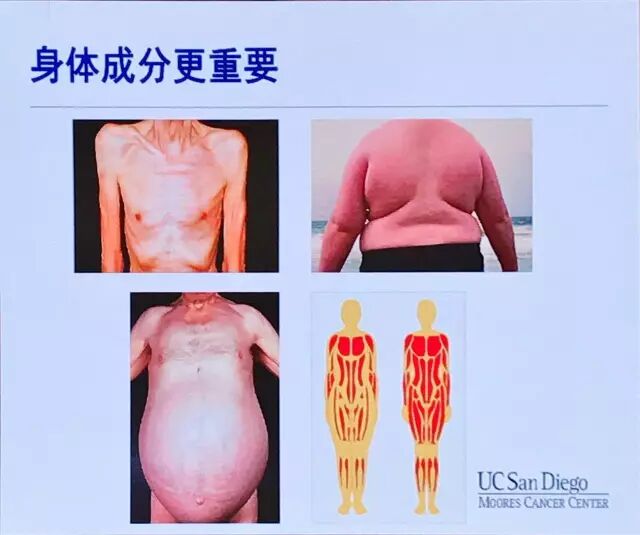 在评估身体成分时,其中一项重要的指标为患者的瘦体重(Lean body mass),患者的瘦体重越大,肌肉成分越多,说明体质就越好;反之,如果患者总体重很大,但是脂肪成分很多,也提示患者体质较差,不利于耐受患者进一步的积极治疗。