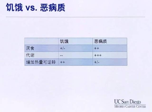 肿瘤恶病质发病初期,临床上很难将CC和饥饿(Starvation)加以鉴别,从而错失了治疗机会,CC的患者较饥饿的患者在厌食程度更加严重,并且通过肠内营养增加热量的方式有时不可逆转。