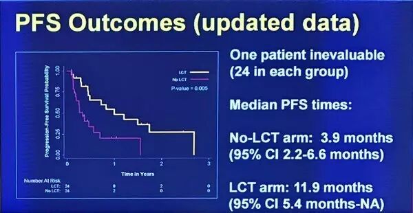 因两组的治疗效果差异过大,中期时停止对照试验,全部患者都进行局部巩固治疗。前期的对照试验中,未接受LCT患者组PSF仅为3.9个月,而LCT治疗组为11.9个月,所以最终试验停止,研究者就中期结果进行了汇报。