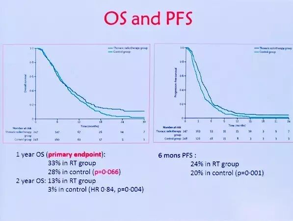 研究的主要终点是1年的总生存(OS),而结果显示,1年期的总生存率在胸部放疗组为33%,对照组为28%。而2年的OS方面,胸部放疗组为13%,对照组为3%。6个月PFS方面,胸部放疗组为24%,对照组为20%。