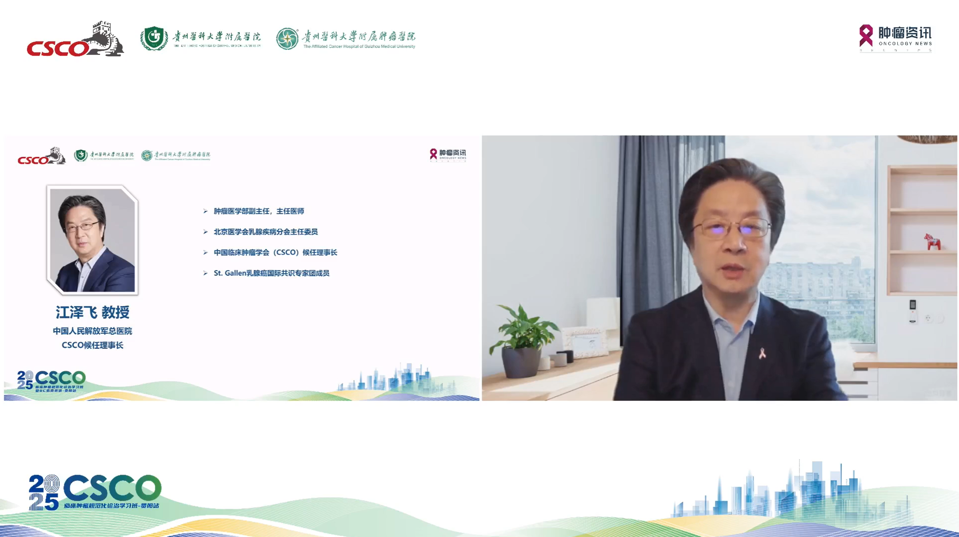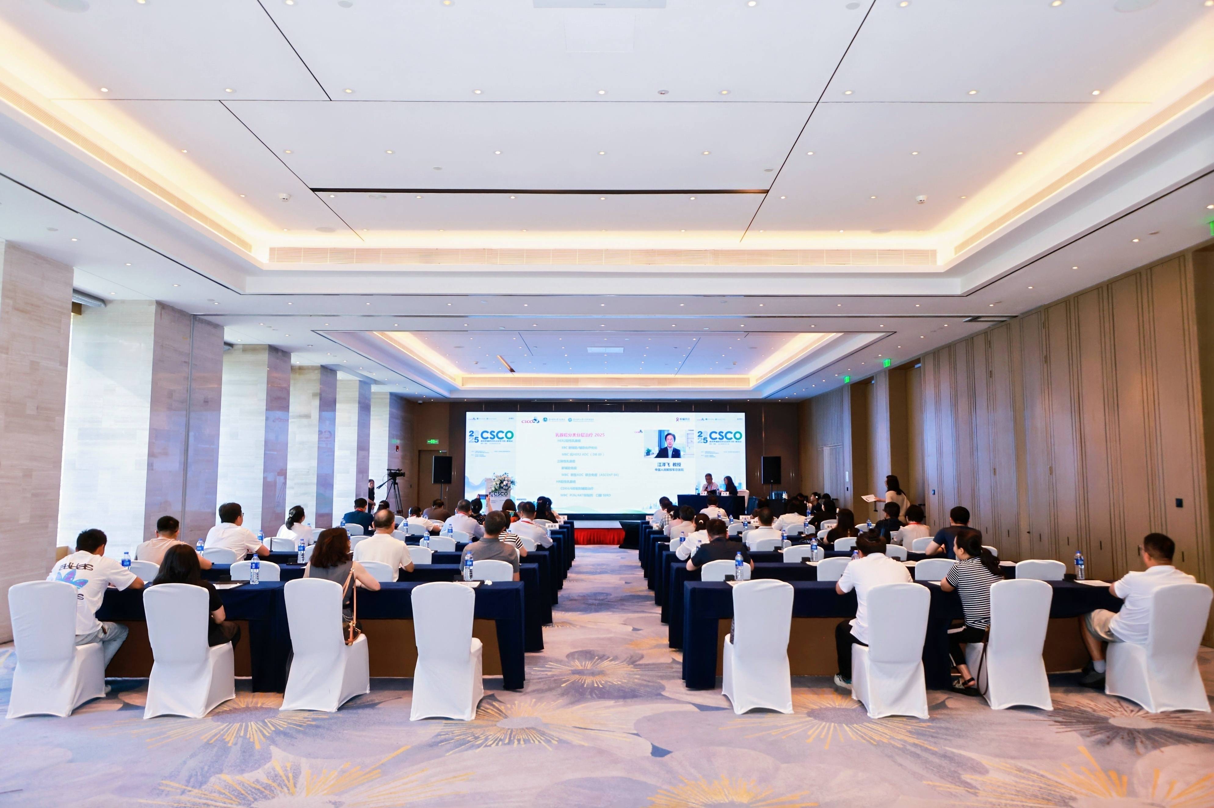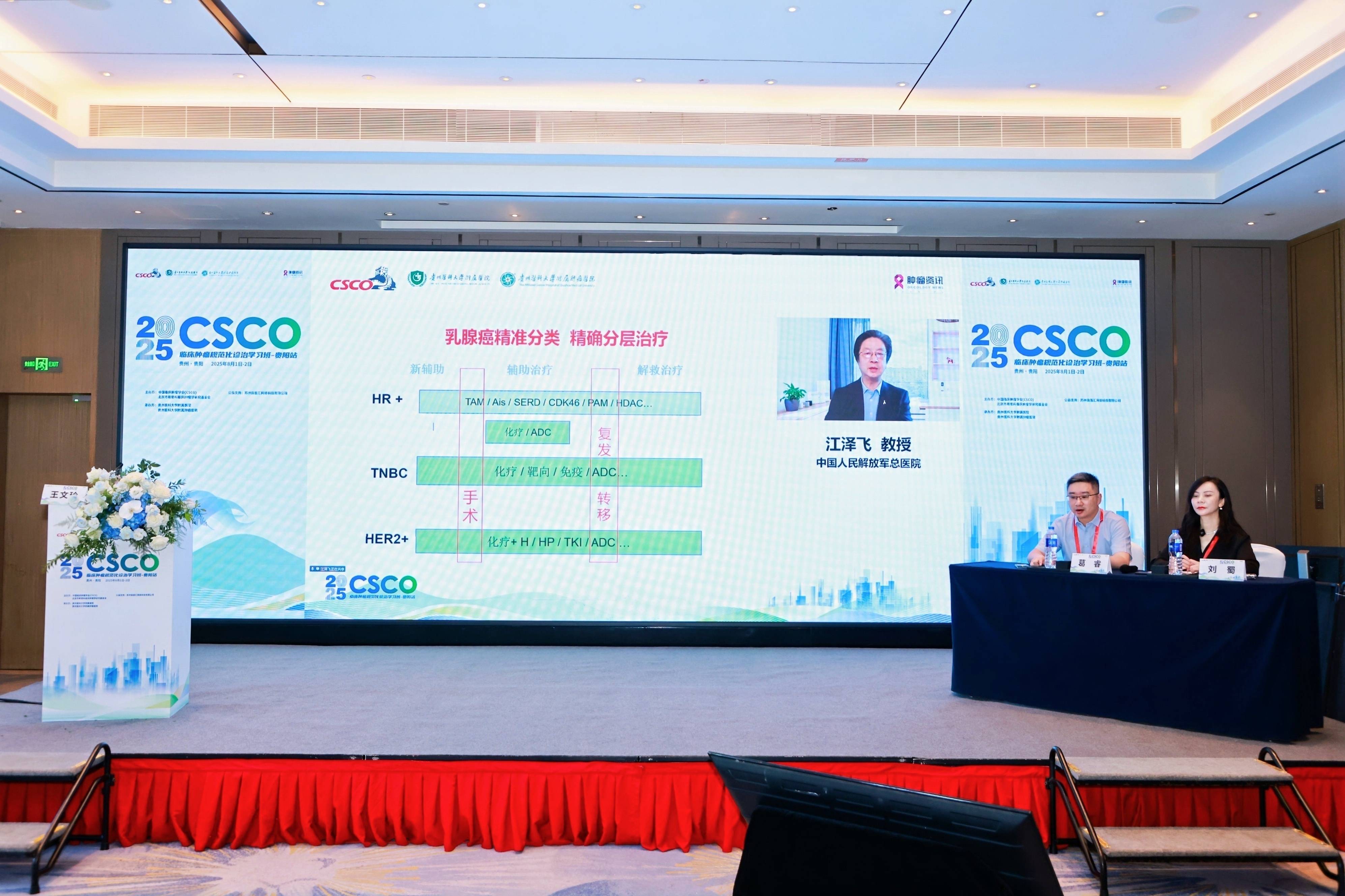 在综合场,大会在贵州医科大学附属医院/附属肿瘤医院金风教授和中国人民解放军总医院、CSCO候任理事长江泽飞教授的致辞中拉开帷幕。上午的议程覆盖广泛。江泽飞教授带来了《CSCO乳腺癌诊疗指南》的2025更新解读,CSCO免疫治疗专委会专家分享了《CSCO免疫检查点抑制剂临床应用指南》的更新解读,复旦大学附属肿瘤医院李小秋教授对《CSCO淋巴瘤诊疗指南》中病理部分进行了详细解读,同济大学附属东方医院郭晔教授深入解读了《CSCO头颈部肿瘤诊疗指南》,哈尔滨血液病肿瘤研究所赵东陆教授则对《CSCO肿瘤所致血小板减少症诊疗指南》进行充分解读。